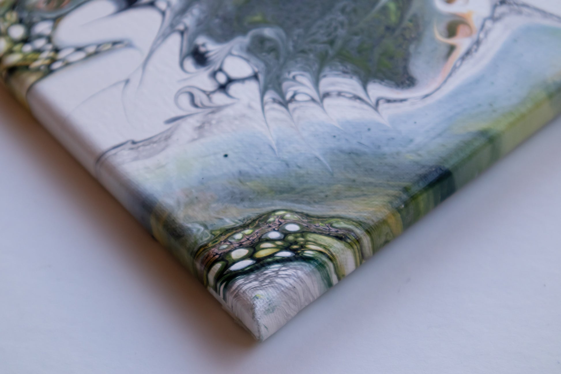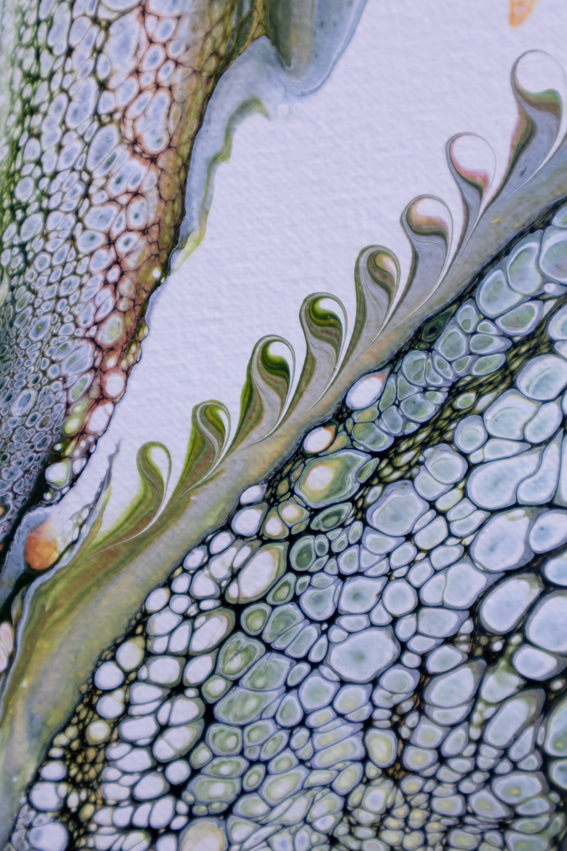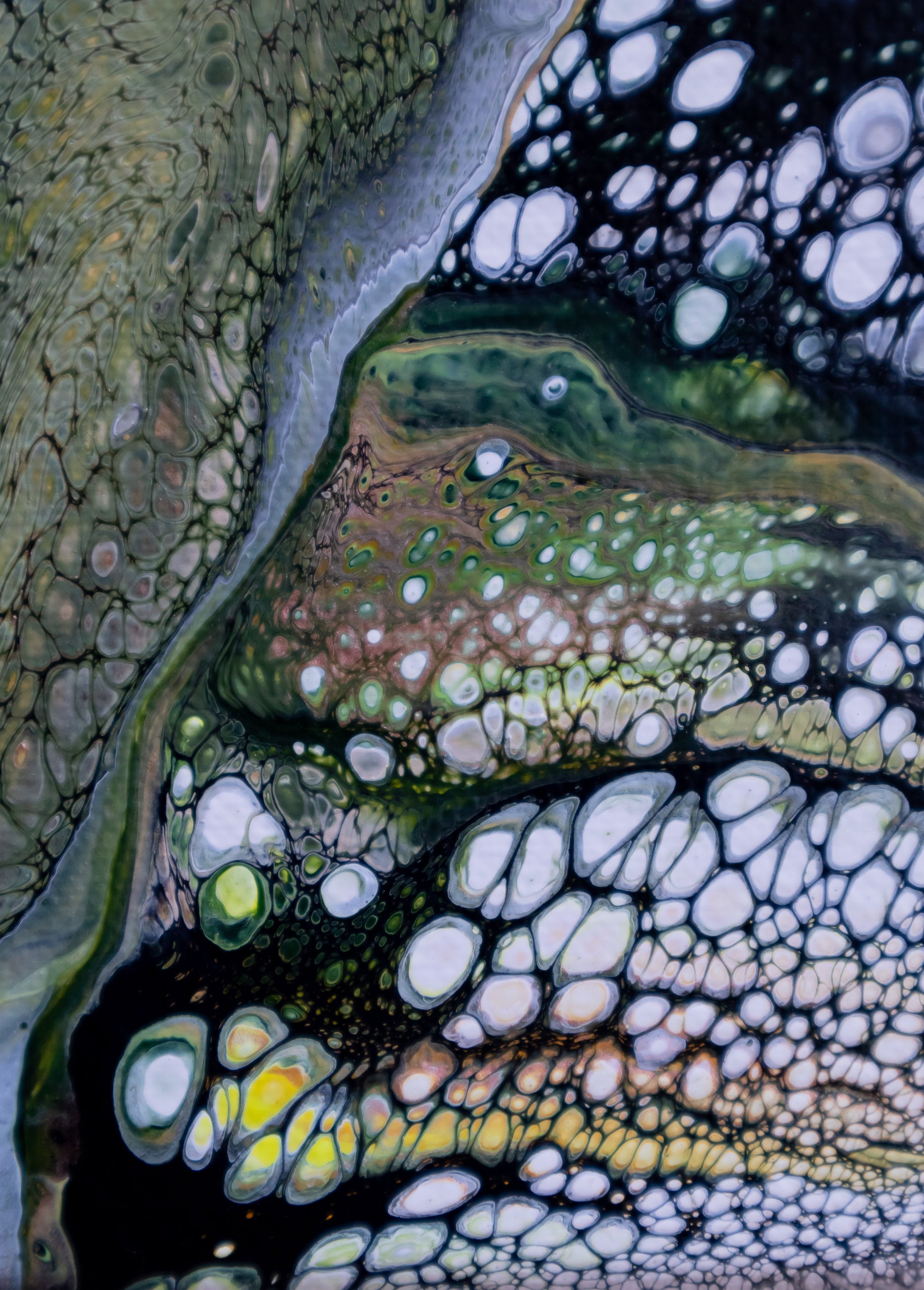 The majestic verticality of the desert Saguaro through the organic flow of acrylics. Layers of green—from pale celadon through rich deep olive tones—establish chromatic depth and spatial complexity. This painting transcends literal representation, allowing pigment movement to suggest growth, resilience, and the quiet dignity of the saguaro.