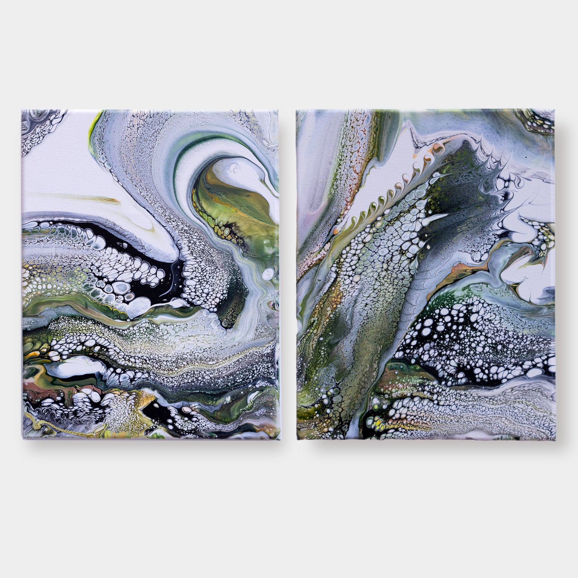 Olive green, sage green black, white, yellow ochre, metallic copper and gold
